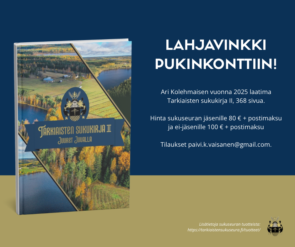 Uusi sukukirja nimeltään Tarkiaisten sukukirja II - juuret Juvalla julkaistaan syksyllä 2023. Varmista, että saat oman kappaleesi tilaamalla kirjan tästä linkistä. ...